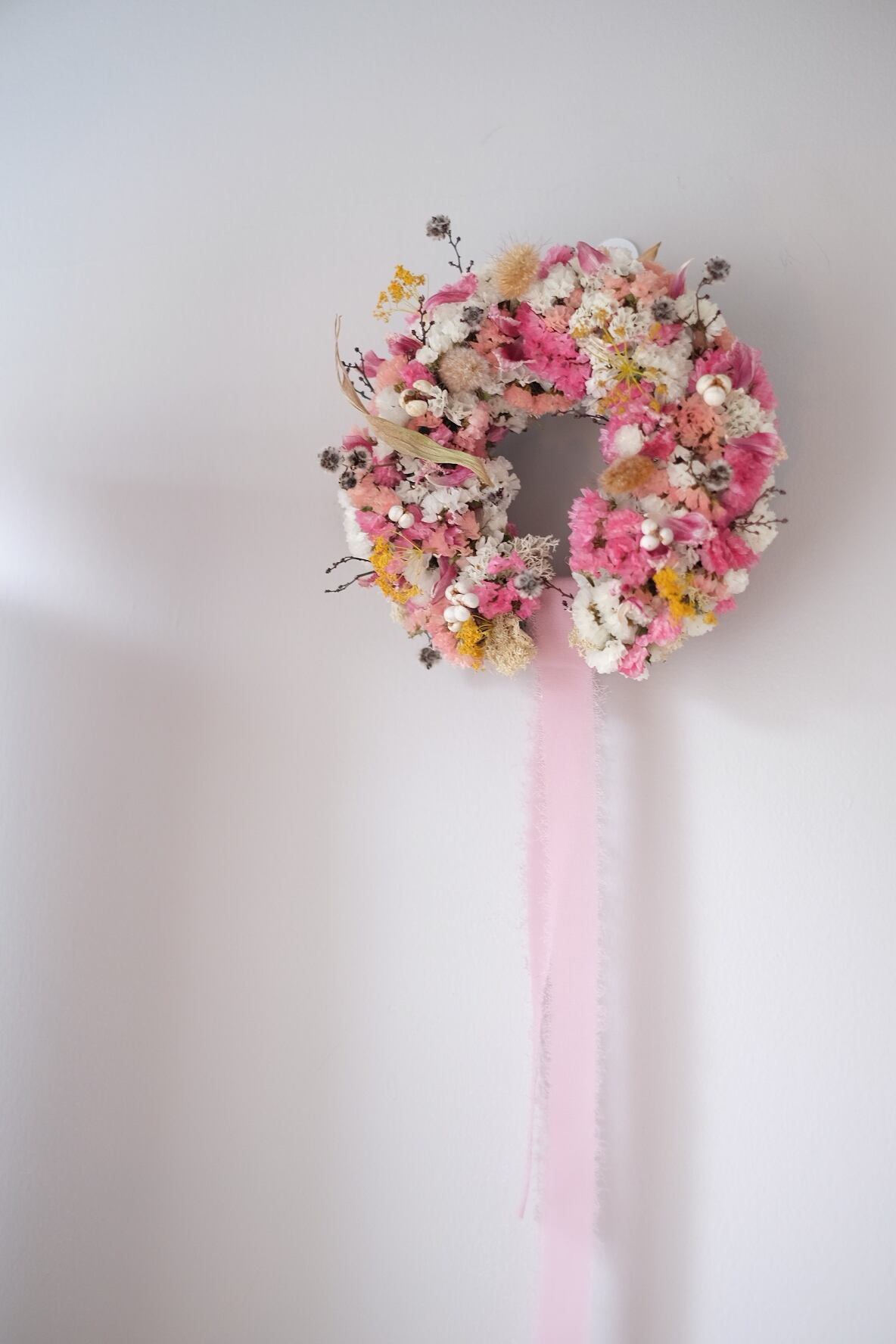 スターチスメインで他の花材を織り交ぜながら、優しい雰囲気でお作りしたリースです。